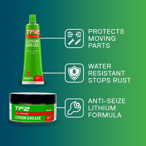 גריז ליתיום WELDTITE TF2 100 גרם, עמיד במים, מושלם לשימון חלקים נעים באופניים. מתאים להד סט, צירים ופדלים. בטוח לשימוש על רכיבי קרבון. שפר את הביצועים!