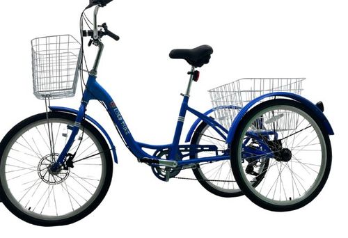 תלת אופן לוקו כחול 24" עם שלדת אלומיניום קלה, הילוכים 6 ומעצורי דיסק הידראוליים. כולל סלסלה קדמית ואחורית. מושלם לרכיבות נוחות ובטוחות!