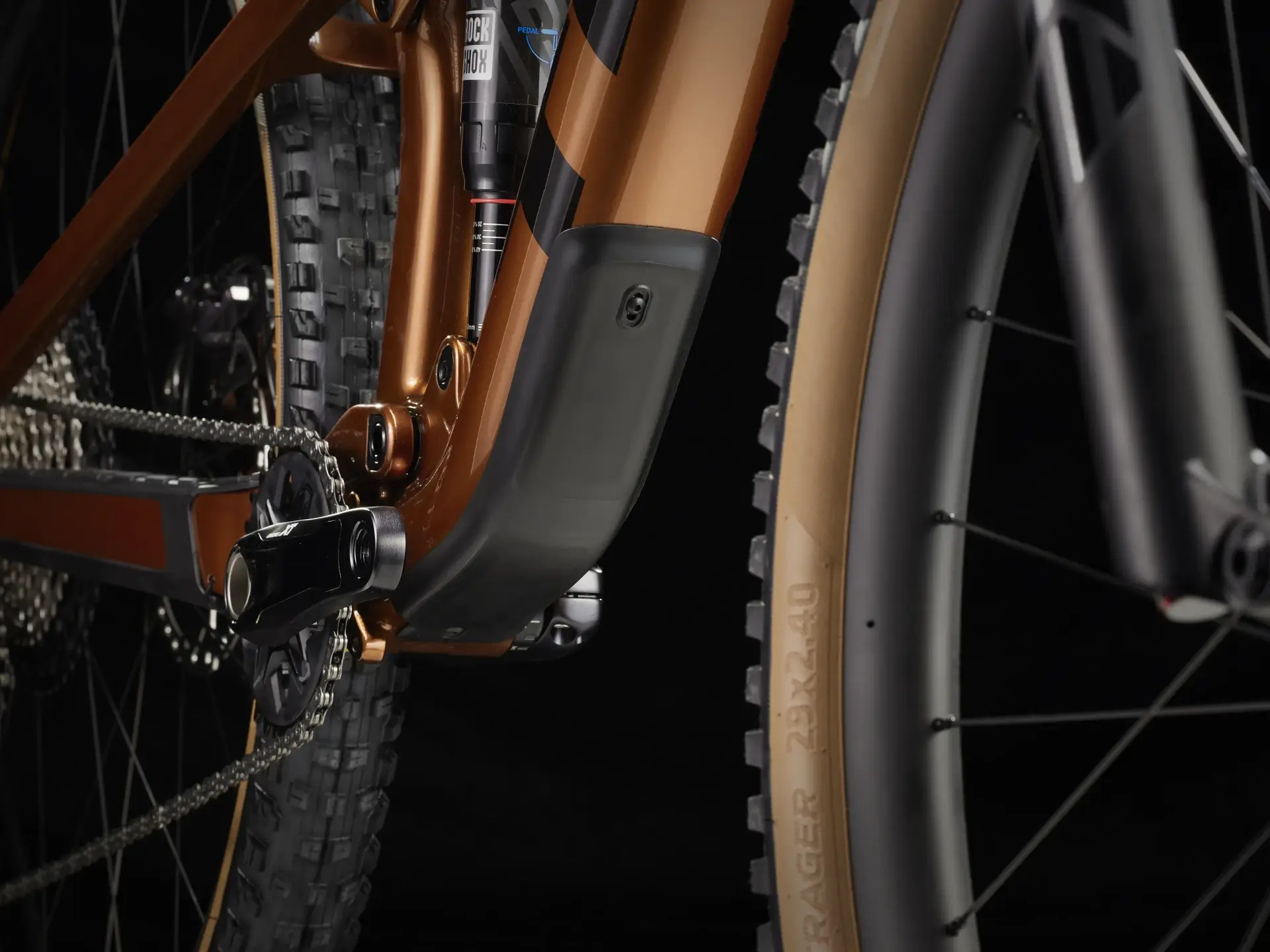 מעצורים SRAM DB 8 4-piston hydraulic disc, עם רוטרים בגודל 180 מ"מ קדמי ו-160 מ"מ אחורי.